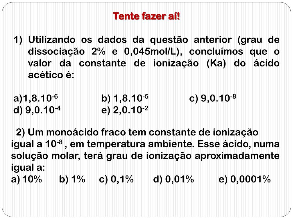Tente fazer aí! Utilizando os dados da questão anterior (grau de dissociação 2% e 0,045mol/L), concluímos que o valor da constante de ionização (Ka) do ácido acético é: a)1,8.10-6 b) 1,8.10-5 c) 9,0.10-8 d) 9,0.10-4 e) 2,0.10-2 2) Um monoácido fraco tem constante de ionização igual a 10-8 , em temperatura ambiente. Esse ácido, numa solução molar, terá grau de ionização aproximadamente igual a: 10% b) 1% c) 0,1% d) 0,01% e) 0,0001%