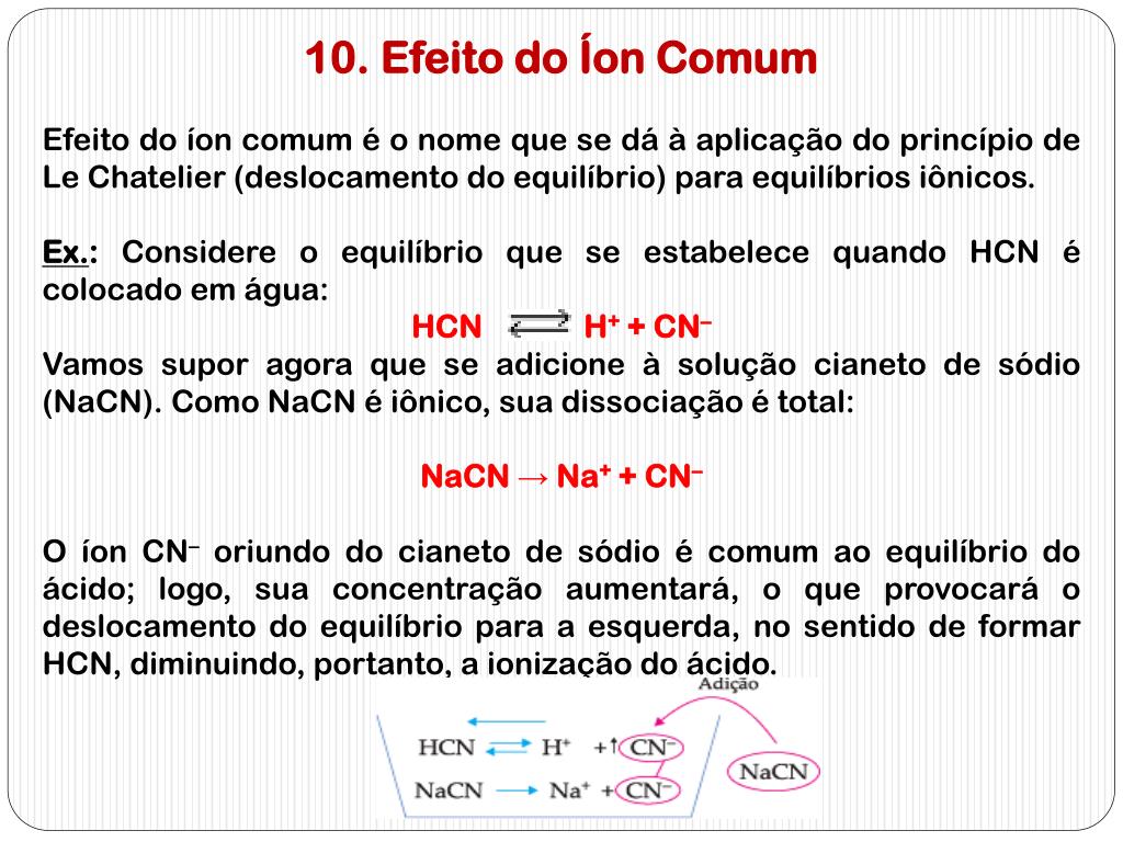 10. Efeito do Íon Comum Efeito do íon comum é o nome que se dá à aplicação do princípio de LeChatelier (deslocamento do equilíbrio) para equilíbrios iônicos. Ex.:Considere o equilíbrio que se estabelece quando HCN é colocado em água: HCNH+ + CN– Vamos supor agora que se adicione à solução cianeto de sódio (NaCN). Como NaCN é iônico, sua dissociação é total: NaCN→Na+ + CN– O íon CN– oriundo do cianeto de sódio é comum ao equilíbrio do ácido; logo, sua concentração aumentará, o que provocará o deslocamento do equilíbrio para a esquerda, no sentido de formar HCN, diminuindo, portanto, a ionização do ácido.