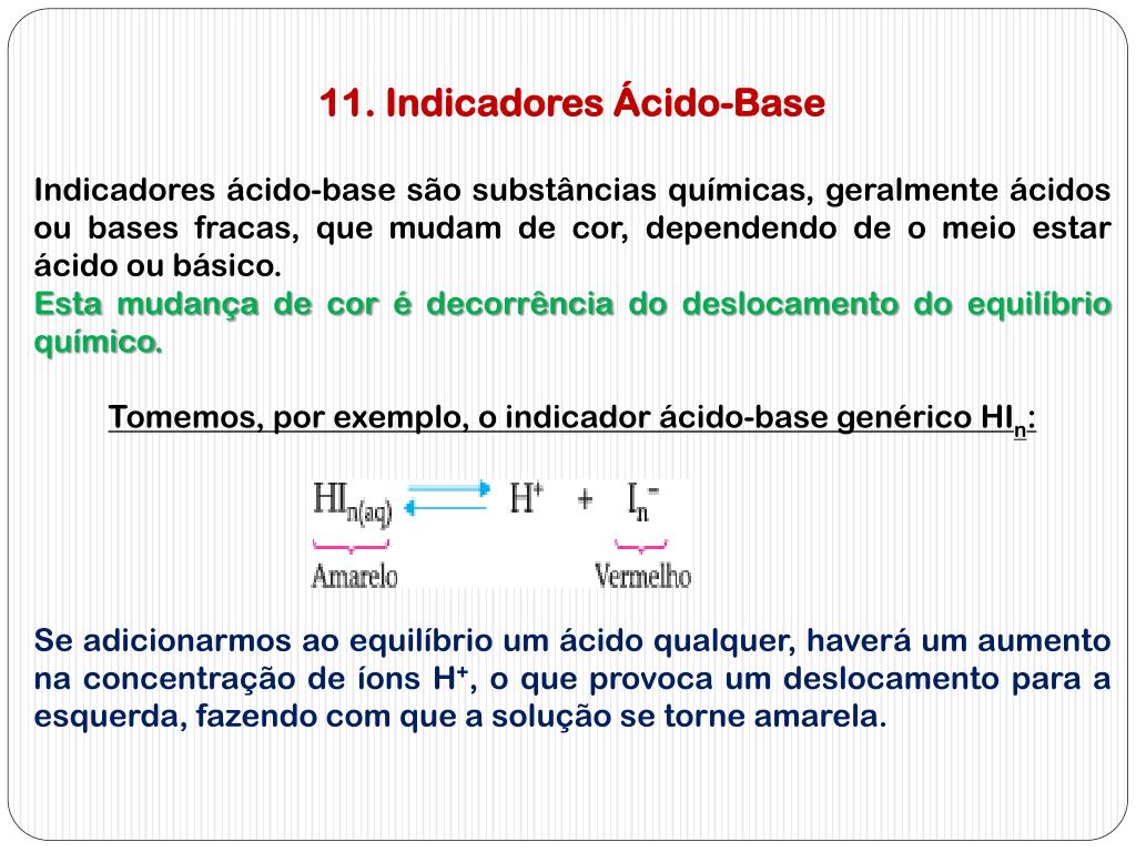 11. Indicadores Ácido-Base Indicadores ácido-base são substâncias químicas, geralmente ácidos ou bases fracas, que mudam de cor, dependendo de o meio estar ácido ou básico. Esta mudança de cor é decorrência do deslocamento do equilíbrio químico. Tomemos, por exemplo, o indicador ácido-base genérico HIn: Se adicionarmos ao equilíbrio um ácido qualquer, haverá um aumento na concentração de íons H+, o que provoca um deslocamento para a esquerda, fazendo com que a solução se torne amarela.