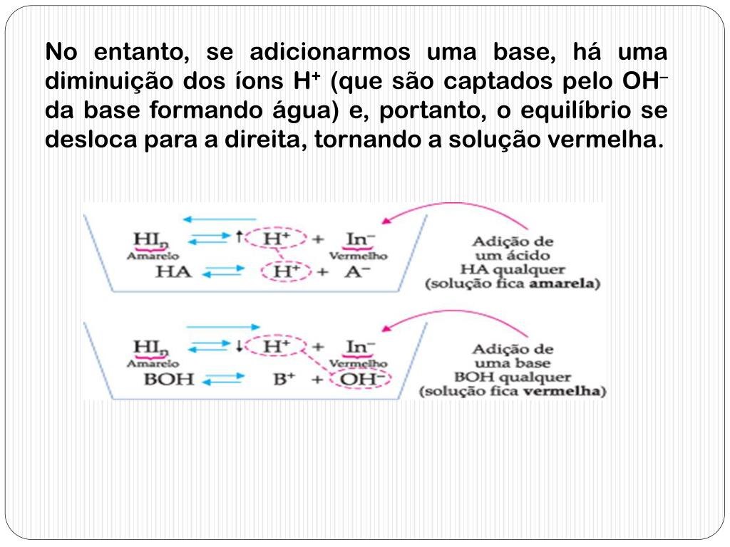 No entanto, se adicionarmos uma base, há uma diminuição dos íons H+ (que são captados pelo OH– da base formando água) e, portanto, o equilíbrio se desloca para a direita, tornando a solução vermelha.