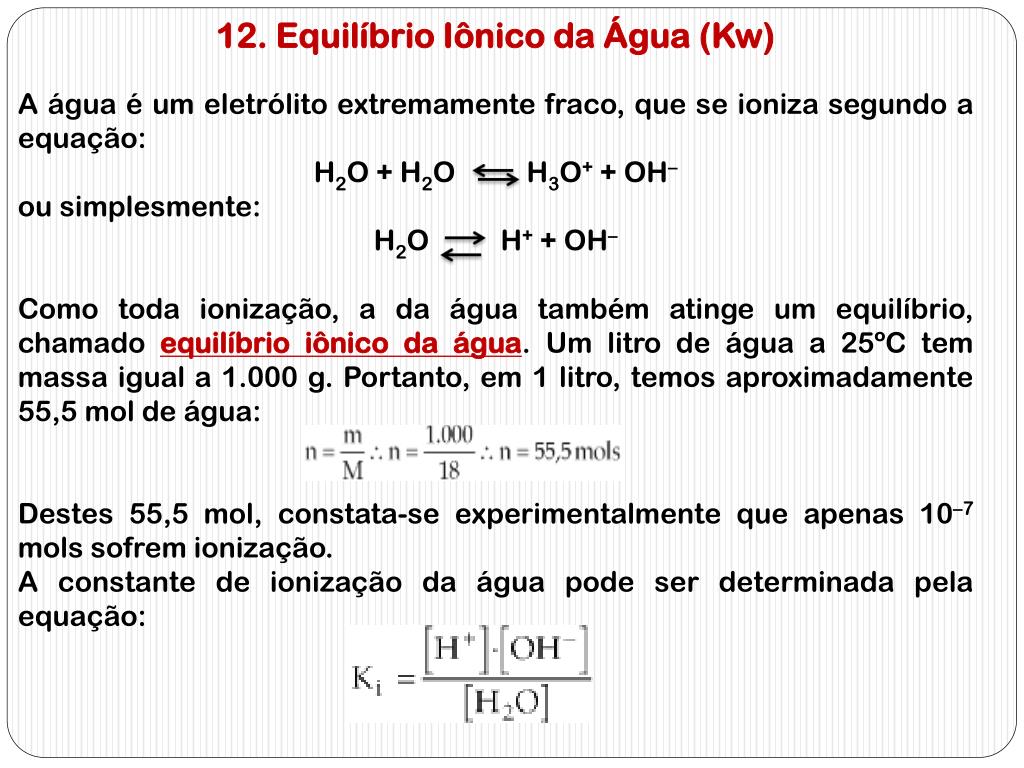 12. Equilíbrio Iônico da Água (Kw) A água é um eletrólito extremamente fraco, que se ioniza segundo a equação: H2O + H2O H3O+ + OH– ou simplesmente: H2O H+ + OH– Como toda ionização, a da água também atinge um equilíbrio, chamado equilíbrio iônico da água. Um litro de água a 25ºC tem massa igual a 1.000 g. Portanto, em 1 litro, temos aproximadamente 55,5 mol de água: Destes 55,5 mol, constata-se experimentalmente que apenas 10–7 mols sofrem ionização. A constante de ionização da água pode ser determinada pela equação: