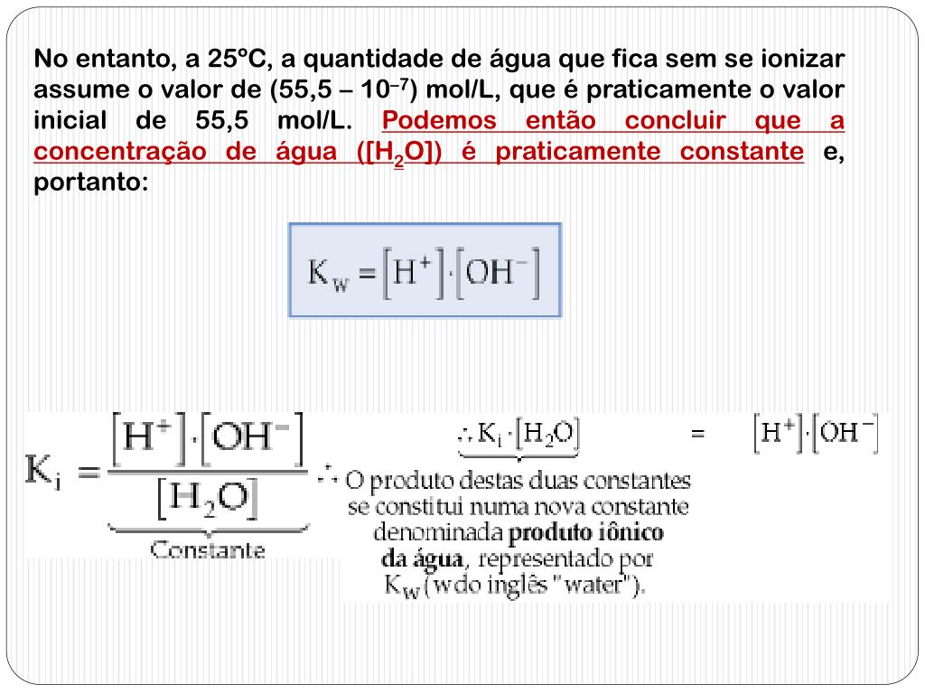 No entanto, a 25ºC, a quantidade de água que fica sem se ionizar assume o valor de (55,5 – 10–7) mol/L, que é praticamente o valor inicial de 55,5 mol/L. Podemos então concluir que a concentração de água ([H2O]) é praticamente constante e, portanto: