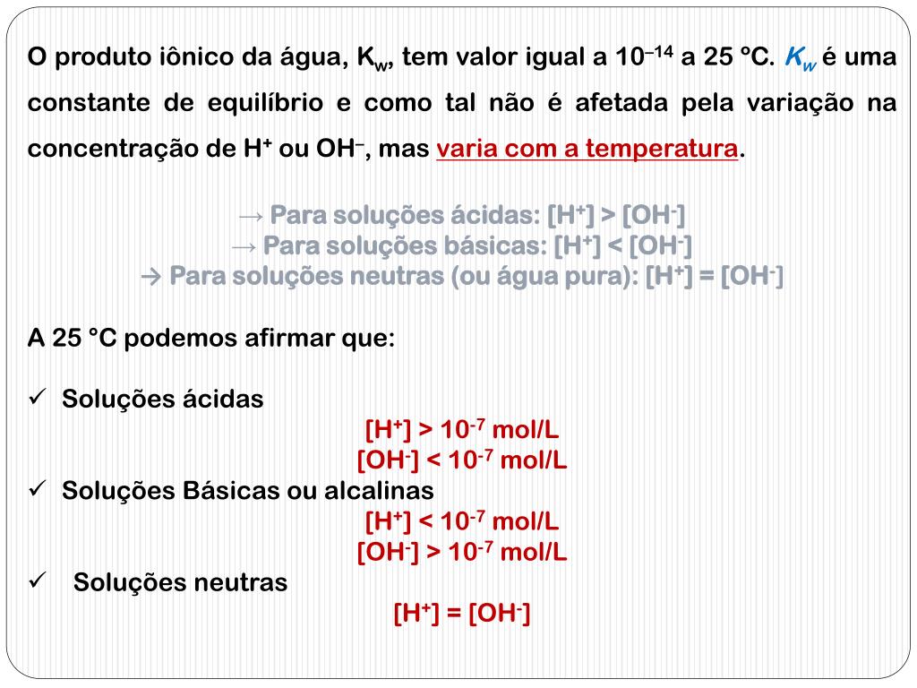 O produto iônico da água, Kw, tem valor igual a 10–14 a 25 ºC.Kwé uma constante de equilíbrio e como tal não é afetada pela variação na concentração de H+ ou OH–, mas varia com a temperatura. • →Para soluções ácidas: [H+] > [OH-] • →Para soluções básicas: [H+] < [OH-] • →Para soluções neutras (ou água pura): [H+] = [OH-] • A 25 °C podemos afirmar que: • Soluções ácidas • [H+] > 10-7 mol/L • [OH-] < 10-7mol/L • Soluções Básicas ou alcalinas • [H+] < 10-7 mol/L • [OH-] > 10-7 mol/L • Soluções neutras • [H+] = [OH-]