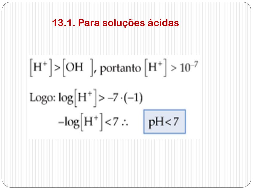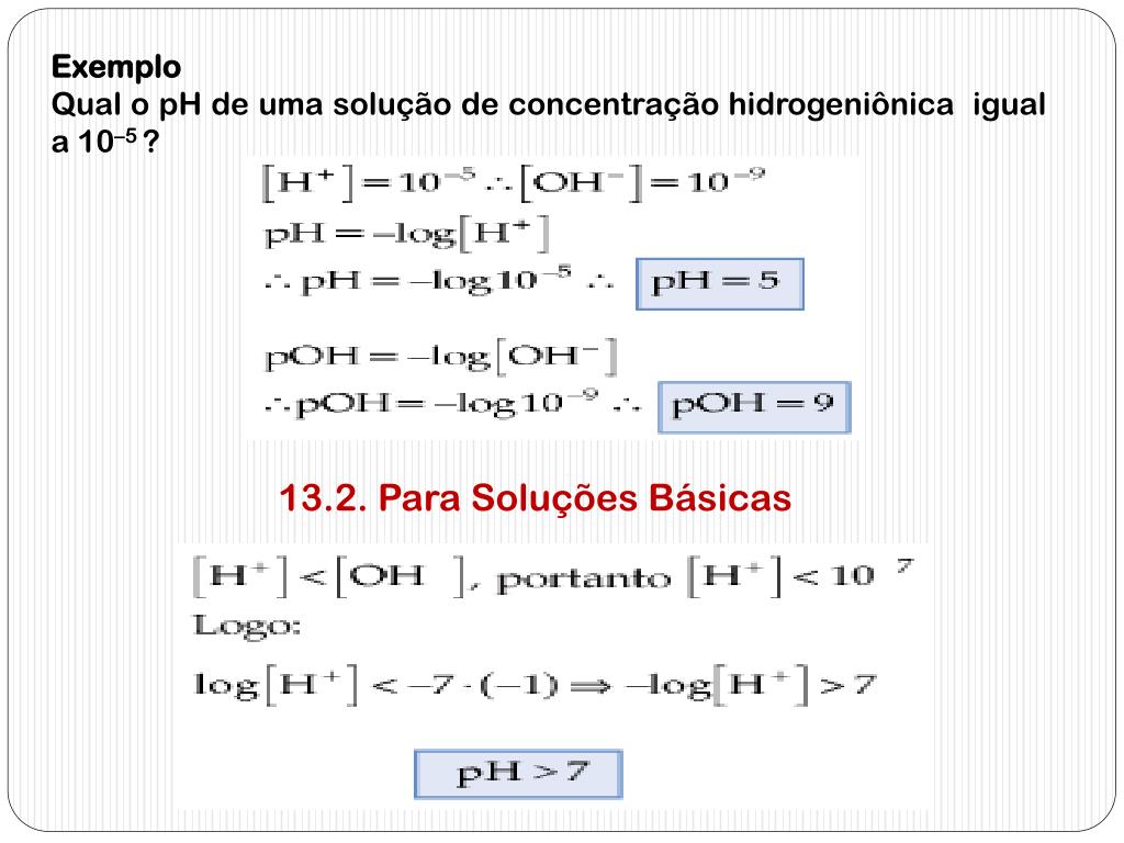 Exemplo • Qual o pH de uma solução de concentração hidrogeniônica igual a 10–5 ? 13.2. Para Soluções Básicas