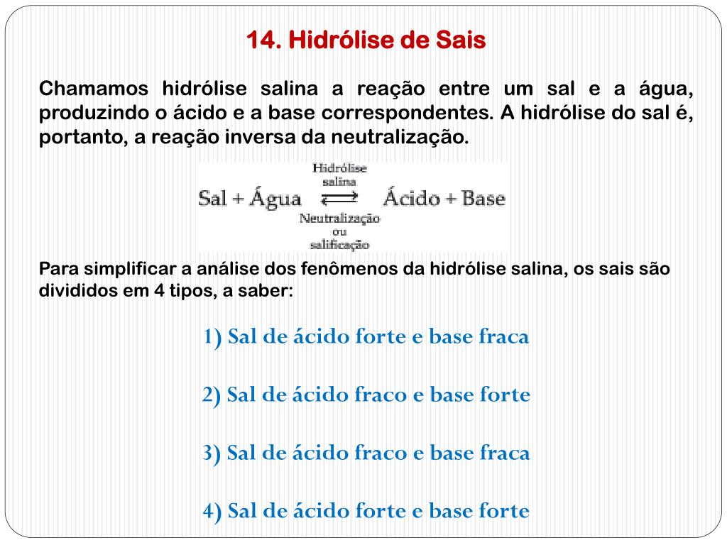 14. Hidrólise de Sais Chamamos hidrólise salina a reação entre um sal e a água, produzindo o ácido e a base correspondentes. A hidrólise do sal é, portanto, a reação inversa da neutralização. Para simplificar a análise dos fenômenos da hidrólise salina, os sais são divididos em 4 tipos, a saber: 1) Sal de ácido forte e base fraca 2) Sal de ácido fraco e base forte 3) Sal de ácido fraco e base fraca 4) Sal de ácido forte e base forte