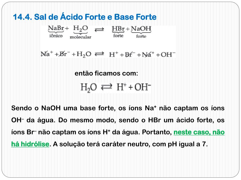 14.4. Sal de Ácido Forte e Base Forte • então ficamos com: Sendo o NaOH uma base forte, os íons Na+ não captam os íons OH– da água. Do mesmo modo, sendo o HBr um ácido forte, os íons Br– não captam os íons H+ da água. Portanto, neste caso, não há hidrólise. A solução terá caráter neutro, com pH igual a 7.