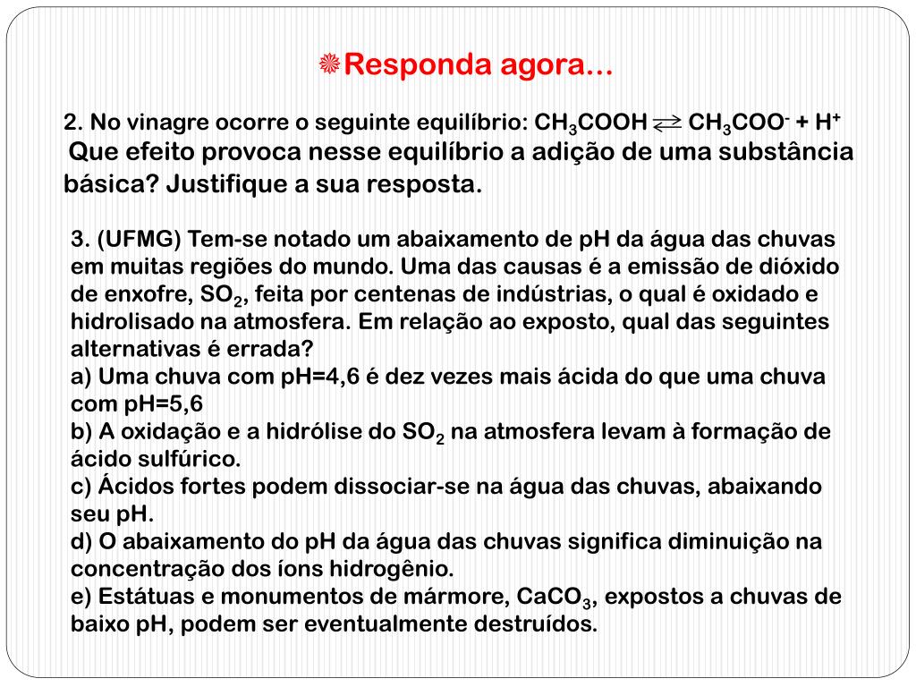 Responda agora... 2. No vinagre ocorre o seguinte equilíbrio: CH3COOH CH3COO- + H+ Que efeito provoca nesse equilíbrio a adição de uma substância básica? Justifique a sua resposta. 3. (UFMG) Tem-se notado um abaixamento de pH da água das chuvas em muitas regiões do mundo. Uma das causas é a emissão de dióxido de enxofre, SO2, feita por centenas de indústrias, o qual é oxidado e hidrolisado na atmosfera. Em relação ao exposto, qual das seguintes alternativas é errada? a) Uma chuva com pH=4,6 é dez vezes mais ácida do que uma chuva com pH=5,6 b) A oxidação e a hidrólise do SO2na atmosfera levam à formação de ácido sulfúrico. c) Ácidos fortes podem dissociar-se na água das chuvas, abaixando seu pH. d) O abaixamento do pH da água das chuvas significa diminuição na concentração dos íons hidrogênio. e) Estátuas e monumentos de mármore, CaCO3, expostos a chuvas de baixo pH, podem ser eventualmente destruídos.