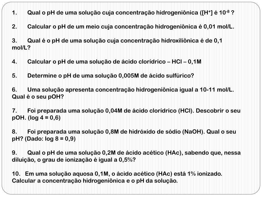 1. Qual o pH de uma solução cuja concentração hidrogeniônica ([H+] é 10-8 ? 2. Calcular o pH de um meio cuja concentração hidrogeniônica é 0,01 mol/L. 3. Qual é o pH de uma solução cuja concentração hidroxiliônica é de 0,1 mol/L? 4. Calcular o pH de uma solução de ácido clorídrico – HCl – 0,1M 5. Determine o pH de uma solução 0,005M de ácido sulfúrico? 6. Uma solução apresenta concentração hidrogeniônica igual a 10-11 mol/L. Qual é o seu pOH? 7. Foi preparada uma solução 0,04M de ácido clorídrico (HCl). Descobrir o seu pOH. (log 4 = 0,6) 8. Foi preparada uma solução 0,8M de hidróxido de sódio (NaOH). Qual o seu pH? (Dado: log 8 = 0,9) 9. Qual o pH de uma solução 0,2M de ácido acético (HAc), sabendo que, nessa diluição, o grau de ionização é igual a 0,5%? 10. Em uma solução aquosa 0,1M, o ácido acético (HAc) está 1% ionizado. Calcular a concentração hidrogeniônica e o pH da solução.