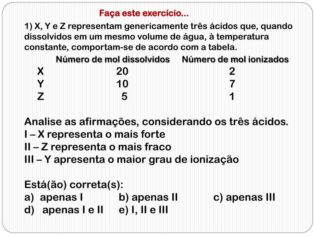 Faça este exercício... 1) X, Y e Z representam genericamente três ácidos que, quando dissolvidos em um mesmo volume de água, à temperatura constante, comportam-se de acordo com a tabela. Número de mol dissolvidos Número de mol ionizados X 20 2 Y 10 7 Z 5 1 Analise as afirmações, considerando os três ácidos. I – X representa o mais forte II – Z representa o mais fraco III – Y apresenta o maior grau de ionização Está(ão) correta(s): apenas I b) apenas II c) apenas III d) apenas I e II e) I, II e III