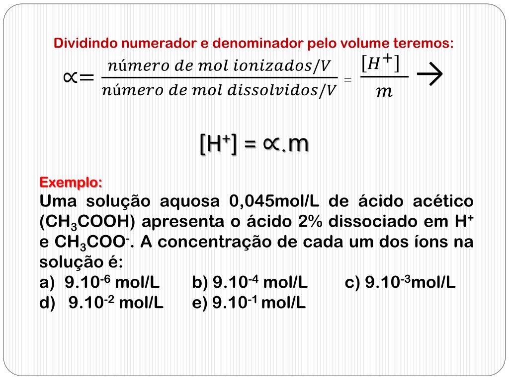 Dividindo numerador e denominador pelo volume teremos: = → [H+] = .m Exemplo: Uma solução aquosa 0,045mol/L de ácido acético (CH3COOH) apresenta o ácido 2% dissociado em H+ e CH3COO-. A concentração de cada um dos íons na solução é: 9.10-6mol/L b) 9.10-4 mol/L c) 9.10-3mol/L d) 9.10-2 mol/L e) 9.10-1 mol/L