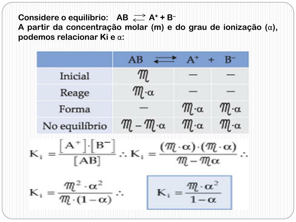 Considere o equilíbrio: AB A+ + B– A partir da concentração molar (m) e do grau de ionização (α), podemos relacionar Ki e α: