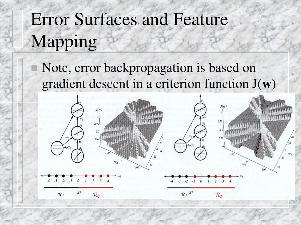 Error Surfaces and Feature Mapping • Note, error backpropagation is based on gradient descent in a criterion function J(w) that is represented represented
