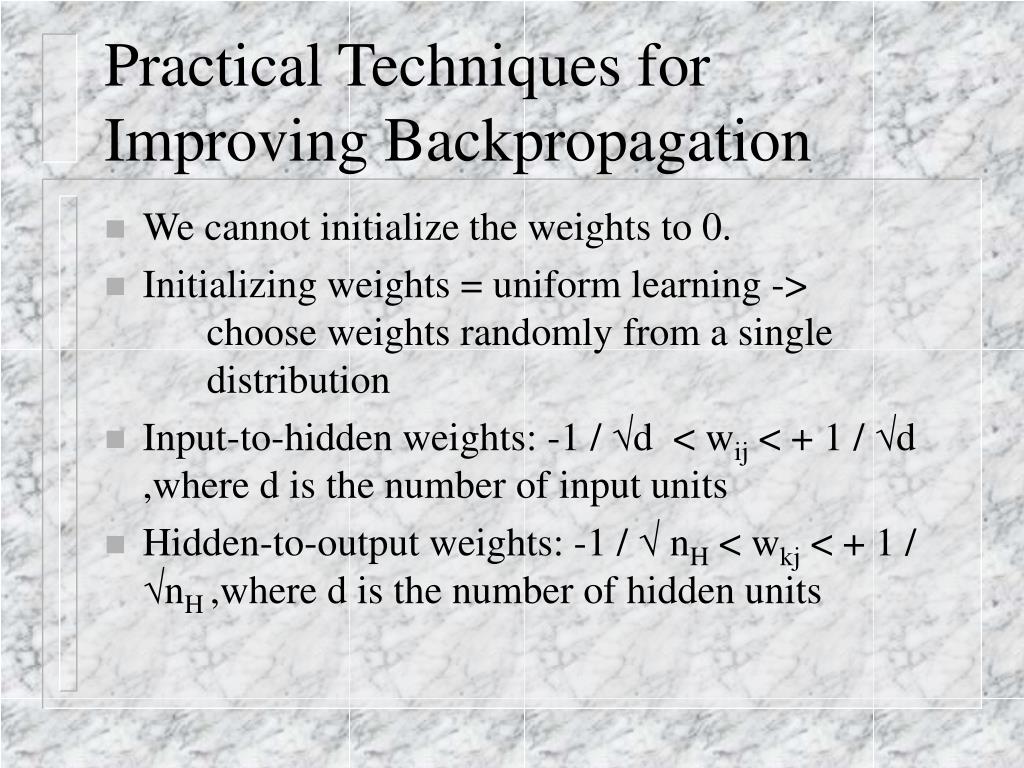 Practical Techniques for Improving Backpropagation • We cannot initialize the weights to 0. • Initializing weights = uniform learning -> choose weights randomly from a single distribution • Input-to-hidden weights: -1 / d < wij < + 1 / d ,where d is the number of input units • Hidden-to-output weights: -1 / nH < wkj < + 1 / nH ,where d is the number of hidden units