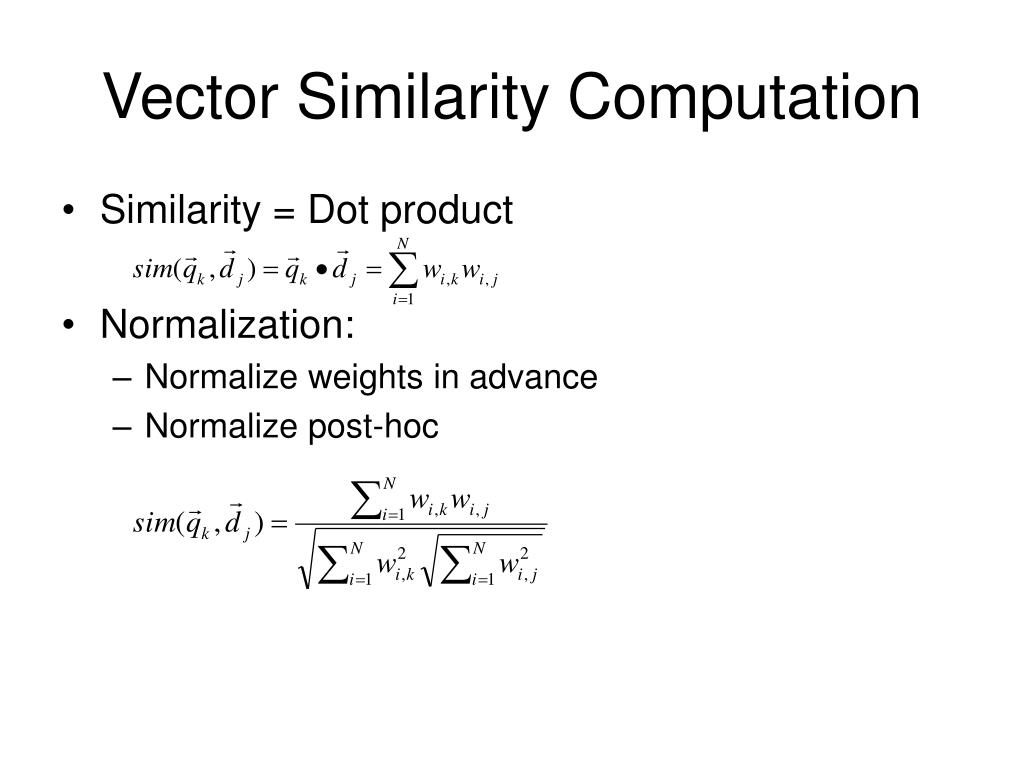 Vector Similarity Computation • Similarity = Dot product • Normalization: • Normalize weights in advance • Normalize post-hoc