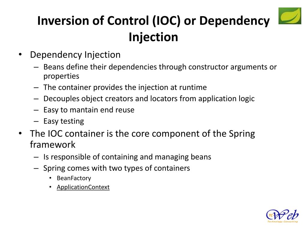 InversionofControl (IOC) or DependencyInjection • DependencyInjection • Beansdefinetheirdependenciesthroughconstructorarguments or properties • The container provides the injection at runtime • Decouplesobjectcreators and locatorsfromapplicationlogic • Easy tomantain end reuse • Easy testing • The IOC container is the corecomponentof the Springframework • Isresponsibleofcontaining and managingbeans • Springcomeswithtwotypesofcontainers • BeanFactory • ApplicationContext