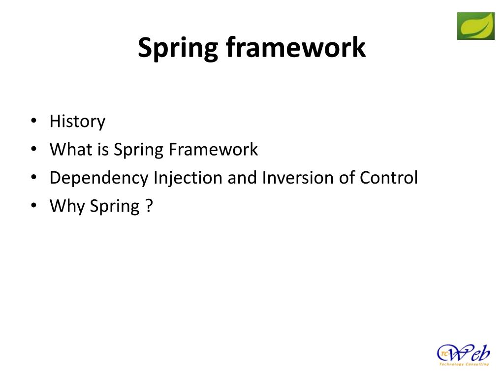 Springframework • History • WhatisSpringFramework • DependencyInjection and InversionofControl • WhySpring ?