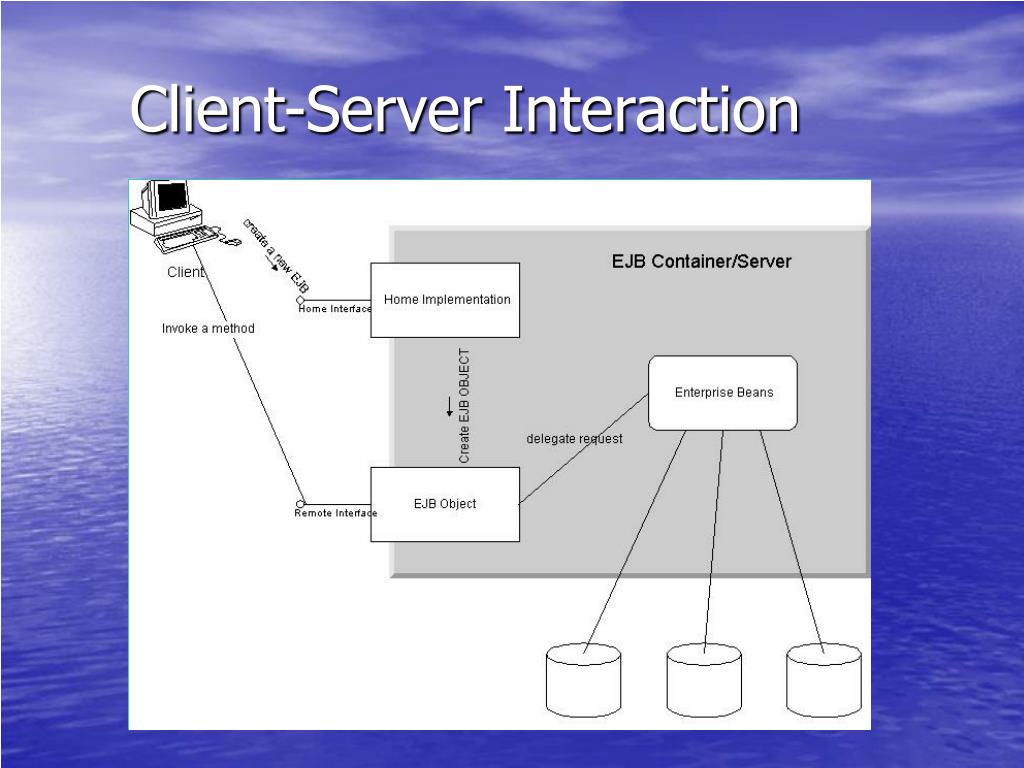 EJBs • Independence form messaging middleware, transaction support, naming & directory services… • Delegates difficult tasks to EJB server • Simplify application development