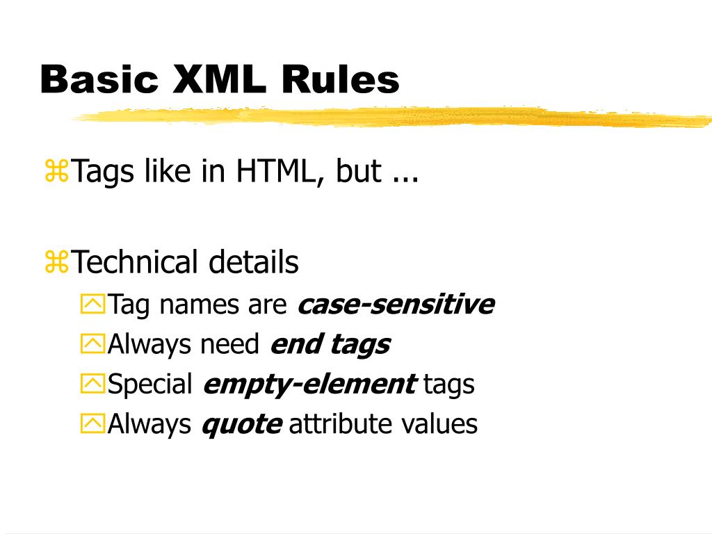Basic XML Rules • Tags like in HTML, but ... • Technical details • Tag names are case-sensitive • Always need end tags • Special empty-element tags • Always quote attribute values