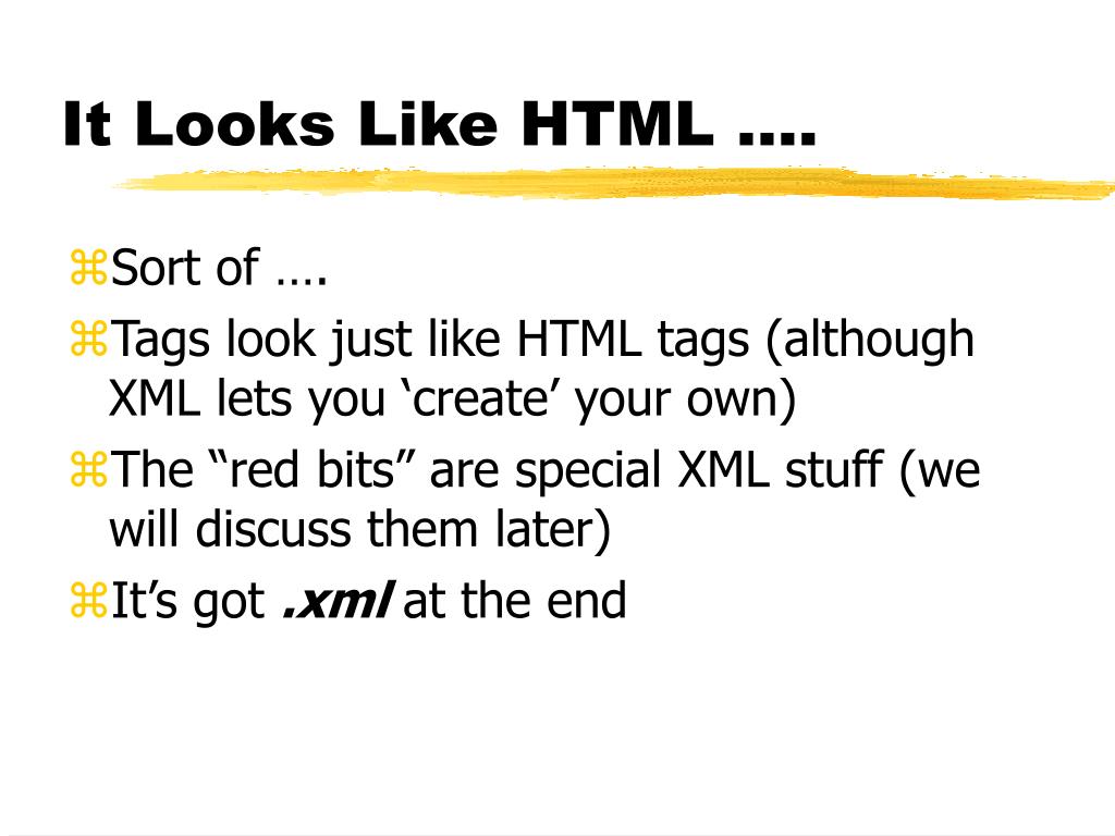 It Looks Like HTML …. • Sort of …. • Tags look just like HTML tags (although XML lets you ‘create’ your own) • The “red bits” are special XML stuff (we will discuss them later) • It’s got .xml at the end