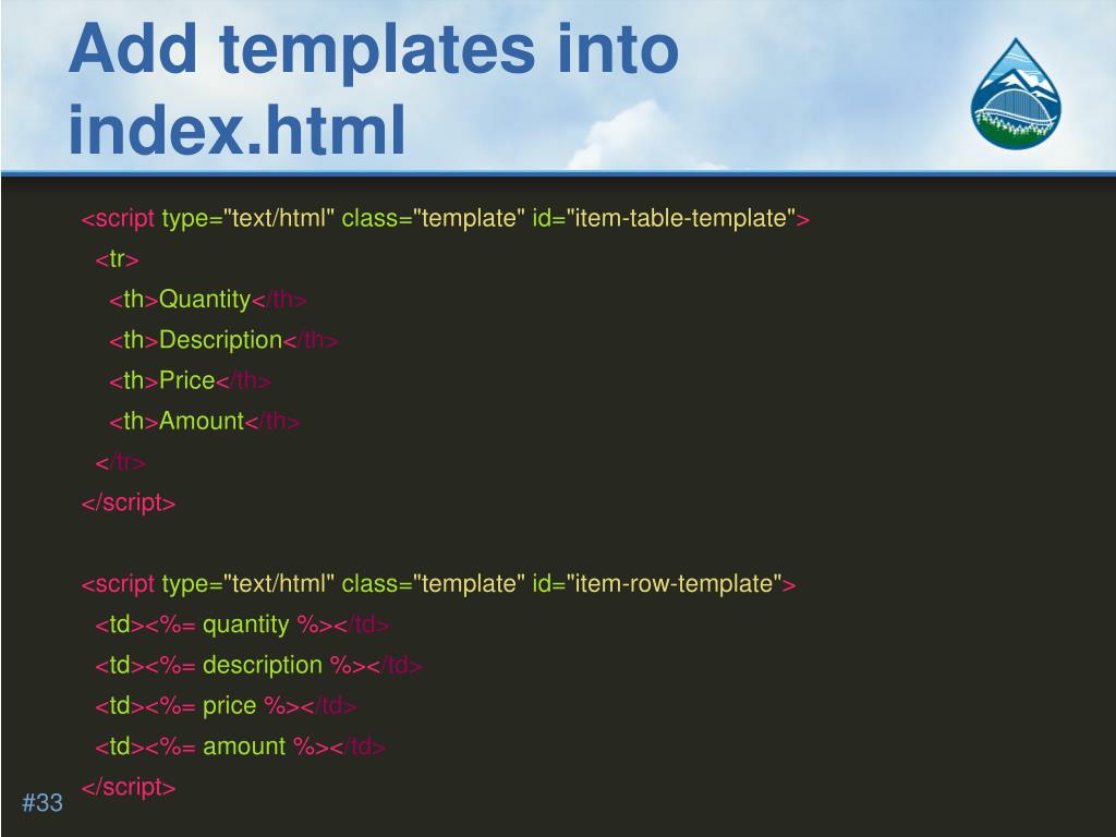 Add templates into index.html <script type="text/html"class="template"id="item-table-template"> <tr> <th>Quantity</th> <th>Description</th> <th>Price</th> <th>Amount</th> </tr> </script> <script type="text/html"class="template"id="item-row-template"> <td><%=quantity%></td> <td><%=description%></td> <td><%=price%></td> <td><%=amount%></td> </script> #33