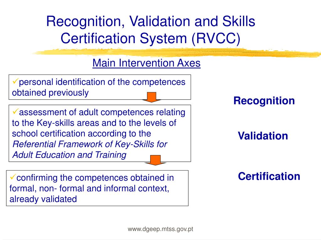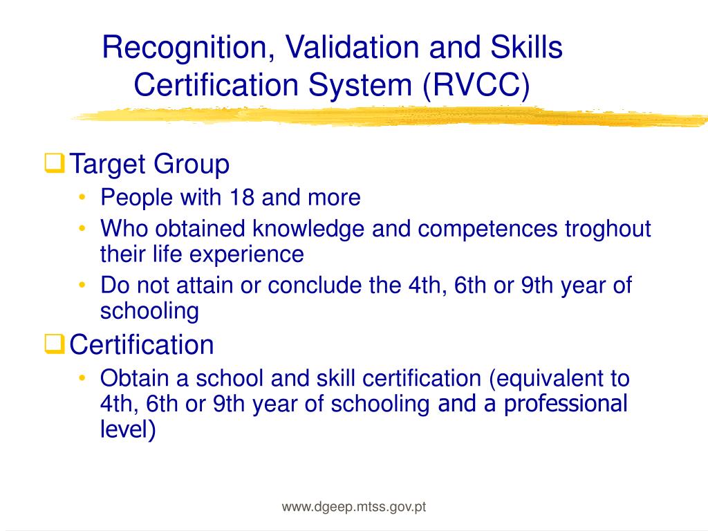 Recognition, Validation and Skills Certification System (RVCC) • Recognition, Validation, and Certification of Skills give the opportunity to all adults over eighteen, without the basic schooling of 9, 6 or 4 years , to obtain the recognition – in personal, social and official terms – of the competences and knowledge obtained in different contexts throughout their life; www.dgeep.mtss.gov.pt