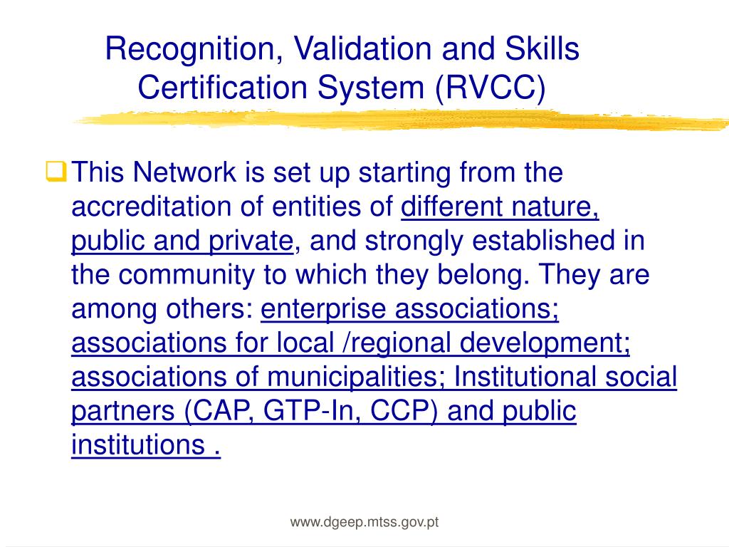 Recognition, Validation and Skills Certification System (RVCC) • This Network is set up starting from the accreditation of entities of different nature, public and private, and strongly established in the community to which they belong. They are among others: enterprise associations; associations for local /regional development; associations of municipalities; Institutional social partners (CAP, GTP-In, CCP) and public institutions . www.dgeep.mtss.gov.pt