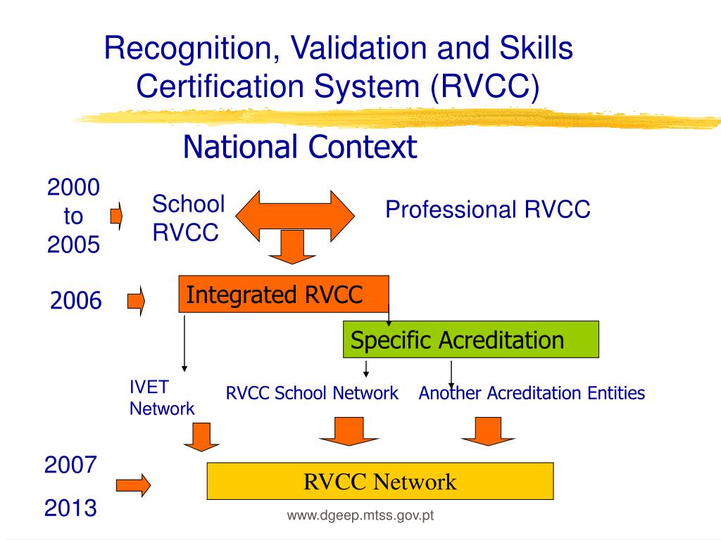Recognition, Validation and Skills Certification System (RVCC) National Context 2000 to 2005 School RVCC Professional RVCC Integrated RVCC 2006 Specific Acreditation IVET Network RVCC School Network Another Acreditation Entities 2007 2013 RVCC Network www.dgeep.mtss.gov.pt