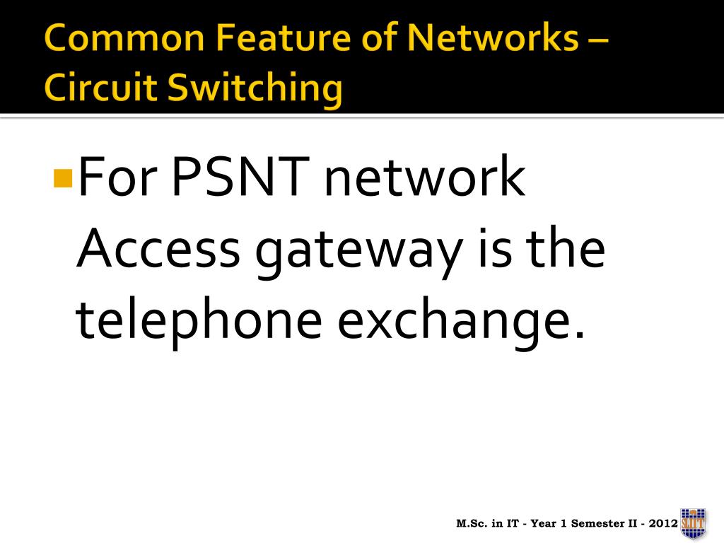 Common Feature of Networks – Circuit Switching • For PSNT network Access gateway is the telephone exchange. M.Sc. in IT - Year 1 Semester II - 2012