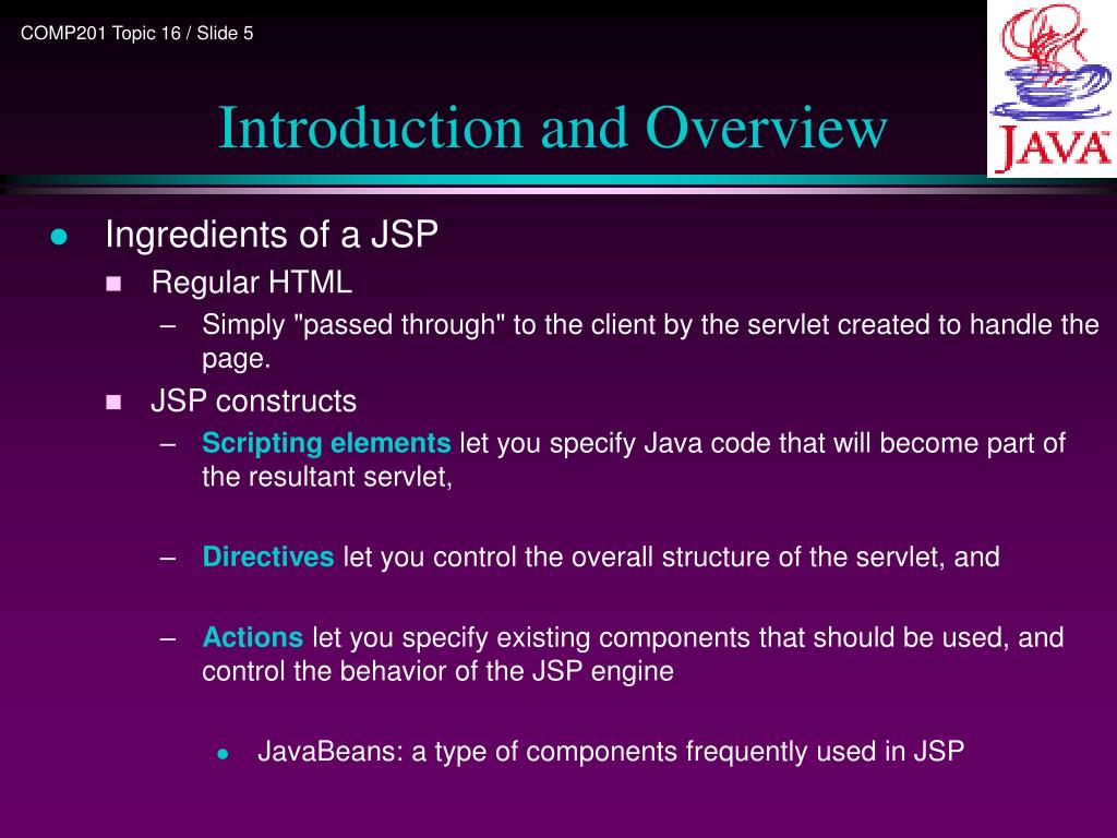 Introduction and Overview • Ingredients of a JSP • Regular HTML • Simply "passed through" to the client by the servlet created to handle the page. • JSP constructs • Scripting elements let you specify Java code that will become part of the resultant servlet, • Directives let you control the overall structure of the servlet, and • Actions let you specify existing components that should be used, and control the behavior of the JSP engine • JavaBeans: a type of components frequently used in JSP