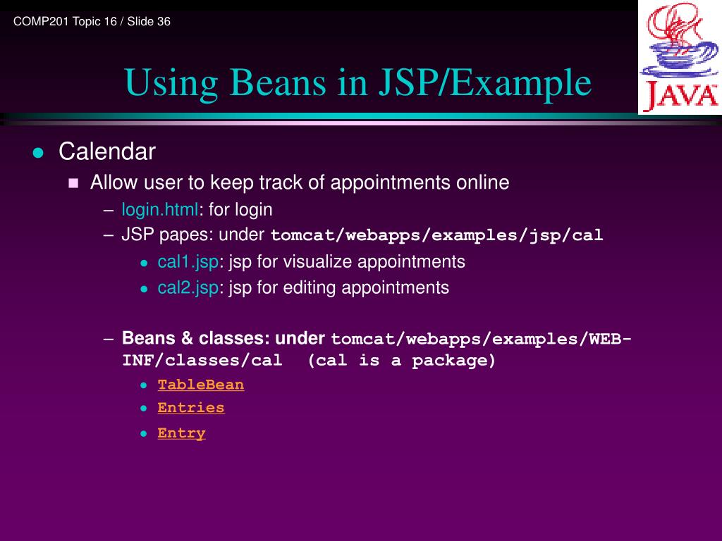 Using Beans in JSP/Example • Calendar • Allow user to keep track of appointments online • login.html: for login • JSP papes: under tomcat/webapps/examples/jsp/cal • cal1.jsp: jsp for visualize appointments • cal2.jsp: jsp for editing appointments • Beans & classes: under tomcat/webapps/examples/WEB-INF/classes/cal (cal is a package) • TableBean • Entries • Entry