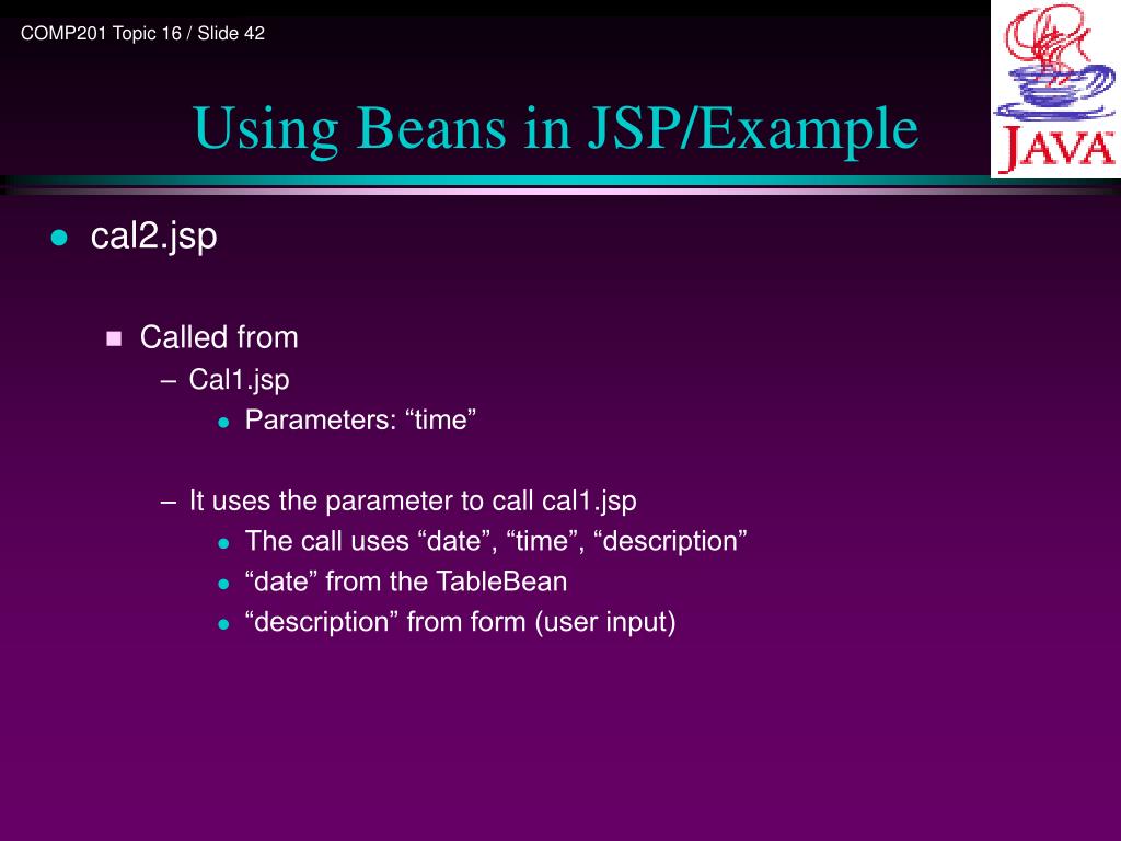 Using Beans in JSP/Example • cal2.jsp • Called from • Cal1.jsp • Parameters: “time” • It uses the parameter to call cal1.jsp • The call uses “date”, “time”, “description” • “date” from the TableBean • “description” from form (user input)