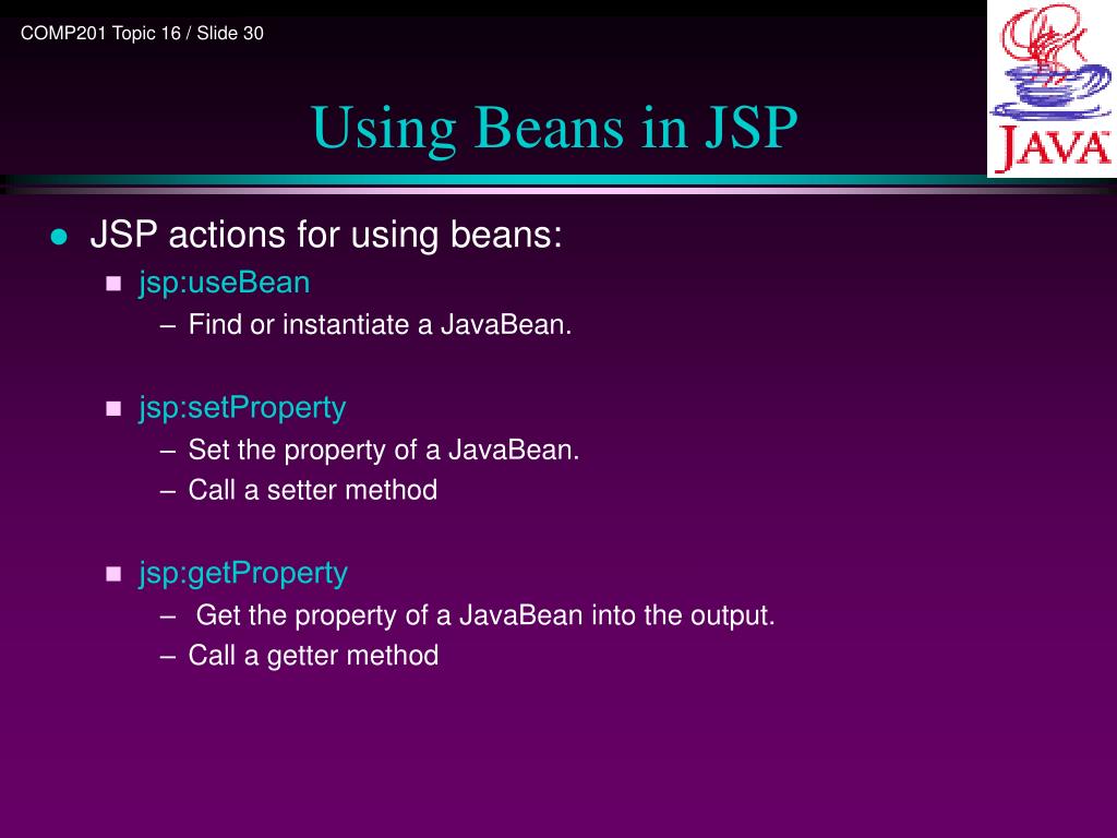 Using Beans in JSP • JSP actions for using beans: • jsp:useBean • Find or instantiate a JavaBean. • jsp:setProperty • Set the property of a JavaBean. • Call a setter method • jsp:getProperty • Get the property of a JavaBean into the output. • Call a getter method