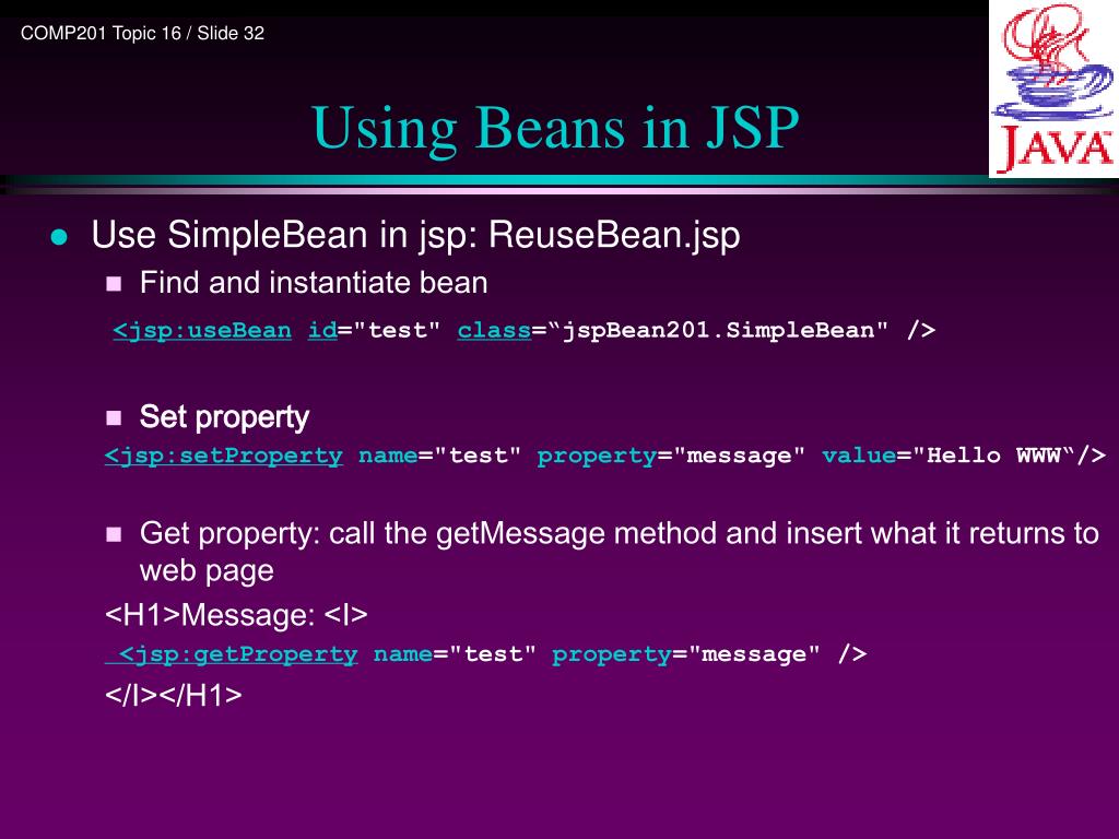 Using Beans in JSP • Use SimpleBean in jsp: ReuseBean.jsp • Find and instantiate bean <jsp:useBeanid="test" class=“jspBean201.SimpleBean" /> • Set property <jsp:setPropertyname="test" property="message" value="Hello WWW“/> • Get property: call the getMessage method and insert what it returns to web page <H1>Message: <I> <jsp:getPropertyname="test" property="message" /> </I></H1>