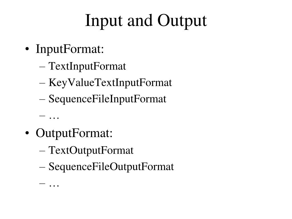 Input and Output • InputFormat: • TextInputFormat • KeyValueTextInputFormat • SequenceFileInputFormat • … • OutputFormat: • TextOutputFormat • SequenceFileOutputFormat • …