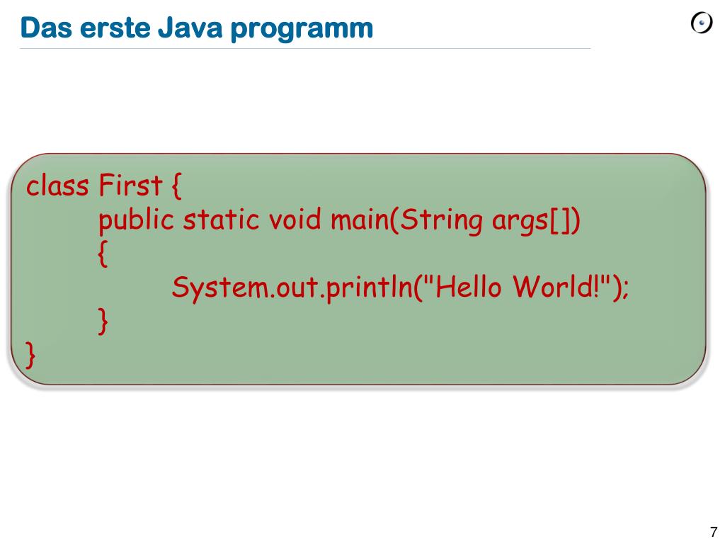 Daserste Java programm class First { public static void main(String args[]) { System.out.println("Hello World!"); } }