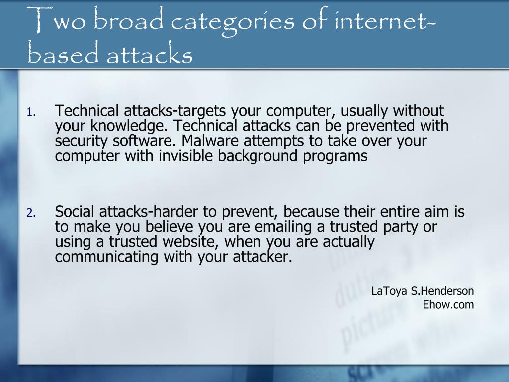 Two broad categories of internet-based attacks • Technical attacks-targets your computer, usually without your knowledge. Technical attacks can be prevented with security software. Malware attempts to take over your computer with invisible background programs • Social attacks-harder to prevent, because their entire aim is to make you believe you are emailing a trusted party or using a trusted website, when you are actually communicating with your attacker. LaToyaS.Henderson Ehow.com