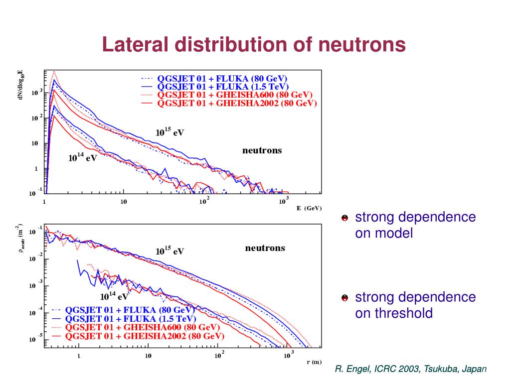 Lateral distribution of neutrons strong dependence on model strong dependence on threshold R. Engel, ICRC 2003, Tsukuba, Japa R. Engel, ICRC 2003, Tsukuba, Japan