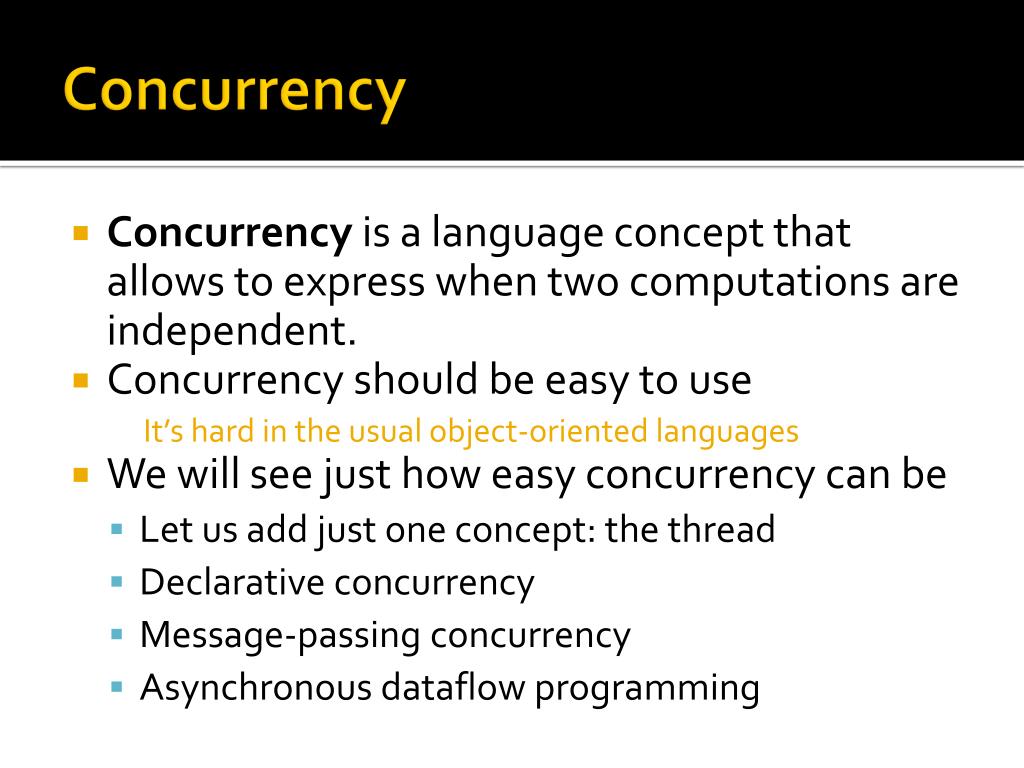 Concurrency • Concurrency is a language concept that allows to express when two computations are independent. • Concurrency should be easy to use It’s hard in the usual object-oriented languages • We will see just how easy concurrency can be • Let us add just one concept: the thread • Declarative concurrency • Message-passing concurrency • Asynchronous dataflow programming