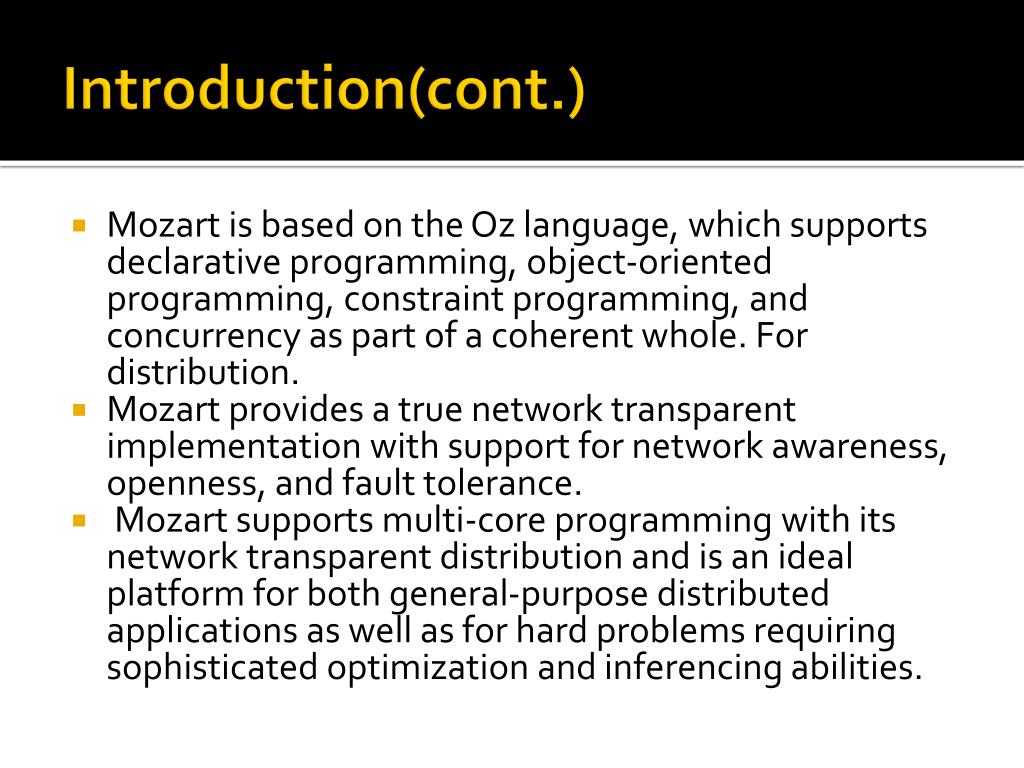 Introduction(cont.) • Mozart is based on the Oz language, which supports declarative programming, object-oriented programming, constraint programming, and concurrency as part of a coherent whole. For distribution. • Mozart provides a true network transparent implementation with support for network awareness, openness, and fault tolerance. • Mozart supports multi-core programming with its network transparent distribution and is an ideal platform for both general-purpose distributed applications as well as for hard problems requiring sophisticated optimization and inferencing abilities.