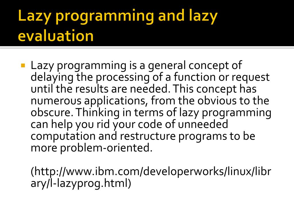 Lazy programming and lazy evaluation • Lazy programming is a general concept of delaying the processing of a function or request until the results are needed. This concept has numerous applications, from the obvious to the obscure. Thinking in terms of lazy programming can help you rid your code of unneeded computation and restructure programs to be more problem-oriented. (http://www.ibm.com/developerworks/linux/library/l-lazyprog.html)