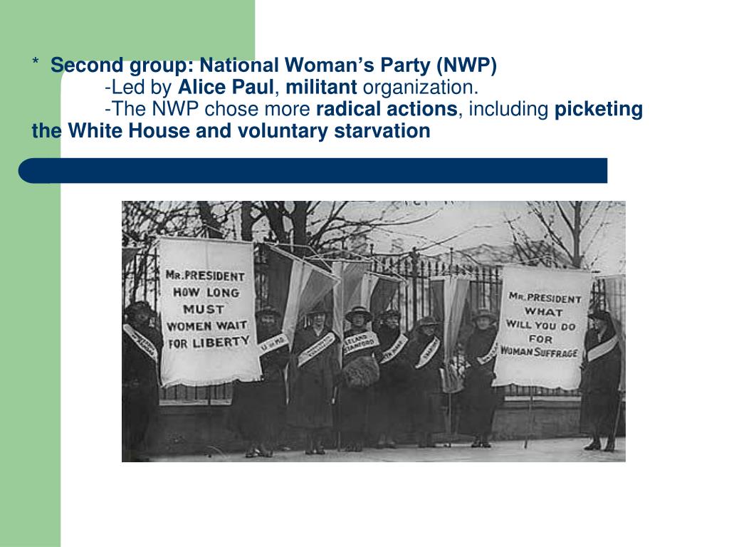 * Second group:National Woman’s Party (NWP) -Led by Alice Paul, militant organization. -The NWP chose more radical actions, including picketing the White House and voluntary starvation