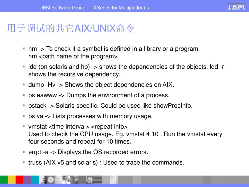 用于调试的其它AIX/UNIX命令 • nm -> To check if a symbol is defined in a library or a program.nm <path name of the program> • ldd (on solaris and hp) -> shows the dependencies of the objects. ldd -r shows the recursive dependency. • dump -Hv -> Shows the object dependencies on AIX. • ps eawww -> Dumps the environment of a process. • pstack -> Solaris specific. Could be used like showProcInfo. • ps va -> Lists processes with memory usage. • vmstat <time interval> <repeat info>Used to check the CPU usage. Eg. vmstat 4 10 . Run the vmstat every four seconds and repeat for 10 times. • errpt -a -> Displays the OS recorded errors. • truss (AIX v5 and solaris) : Used to trace the commands.