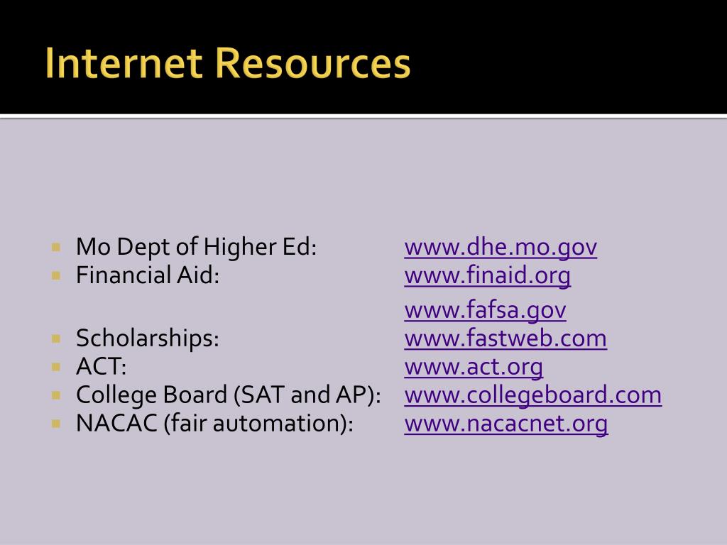 Internet Resources • Mo Dept of Higher Ed: www.dhe.mo.gov • Financial Aid: www.finaid.org www.fafsa.gov • Scholarships: www.fastweb.com • ACT: www.act.org • College Board (SAT and AP): www.collegeboard.com • NACAC (fair automation): www.nacacnet.org
