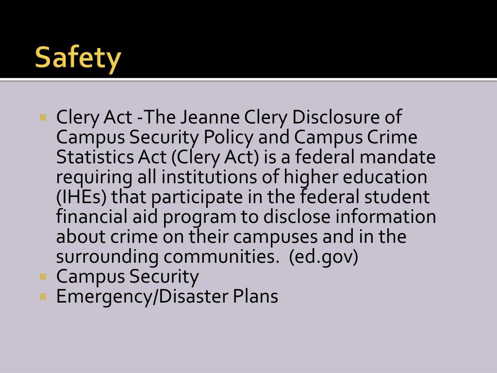 Safety • Clery Act -The Jeanne Clery Disclosure of Campus Security Policy and Campus Crime Statistics Act (Clery Act) is a federal mandate requiring all institutions of higher education (IHEs) that participate in the federal student financial aid program to disclose information about crime on their campuses and in the surrounding communities. (ed.gov) • Campus Security • Emergency/Disaster Plans