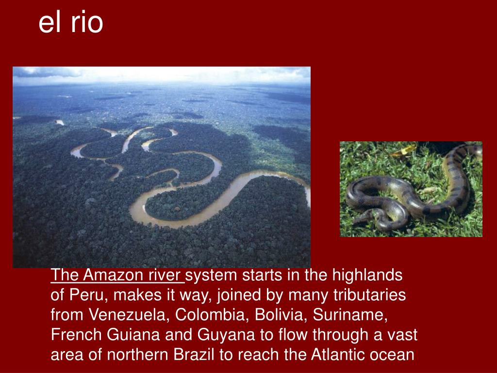 el rio The Amazon river system starts in the highlands of Peru, makes it way, joined by many tributaries from Venezuela, Colombia, Bolivia, Suriname, French Guiana and Guyana to flow through a vast area of northern Brazil to reach the Atlantic ocean
