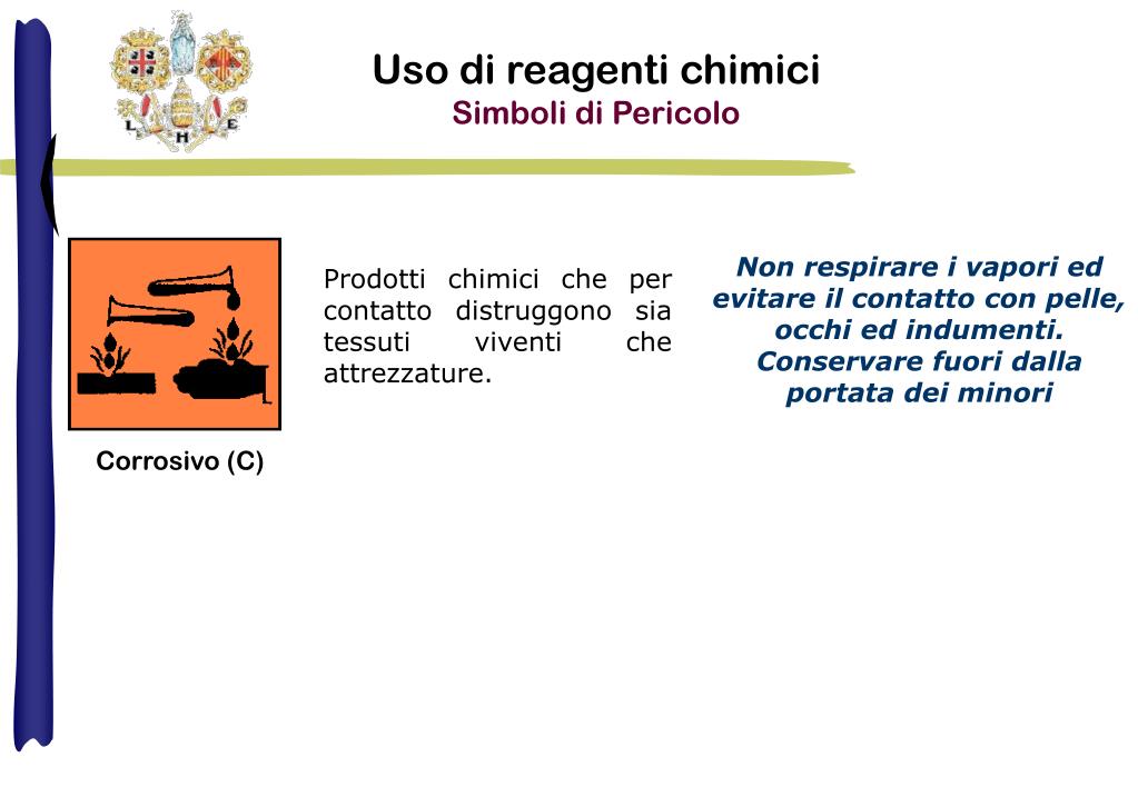 Uso di reagenti chimiciSimboli di Pericolo Non respirare i vapori ed evitare il contatto con pelle, occhi ed indumenti.Conservare fuori dalla portata dei minori Prodotti chimici che per contatto distruggono sia tessuti viventi che attrezzature. Corrosivo (C)