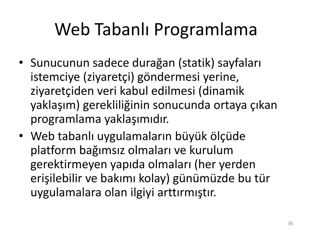 Web Tabanlı Programlama • Sunucunun sadece durağan (statik) sayfaları istemciye (ziyaretçi) göndermesi yerine, ziyaretçiden veri kabul edilmesi (dinamik yaklaşım) gerekliliğinin sonucunda ortaya çıkan programlama yaklaşımıdır. • Web tabanlı uygulamaların büyük ölçüde platform bağımsız olmaları ve kurulum gerektirmeyen yapıda olmaları (her yerden erişilebilir ve bakımı kolay) günümüzde bu tür uygulamalara olan ilgiyi arttırmıştır.