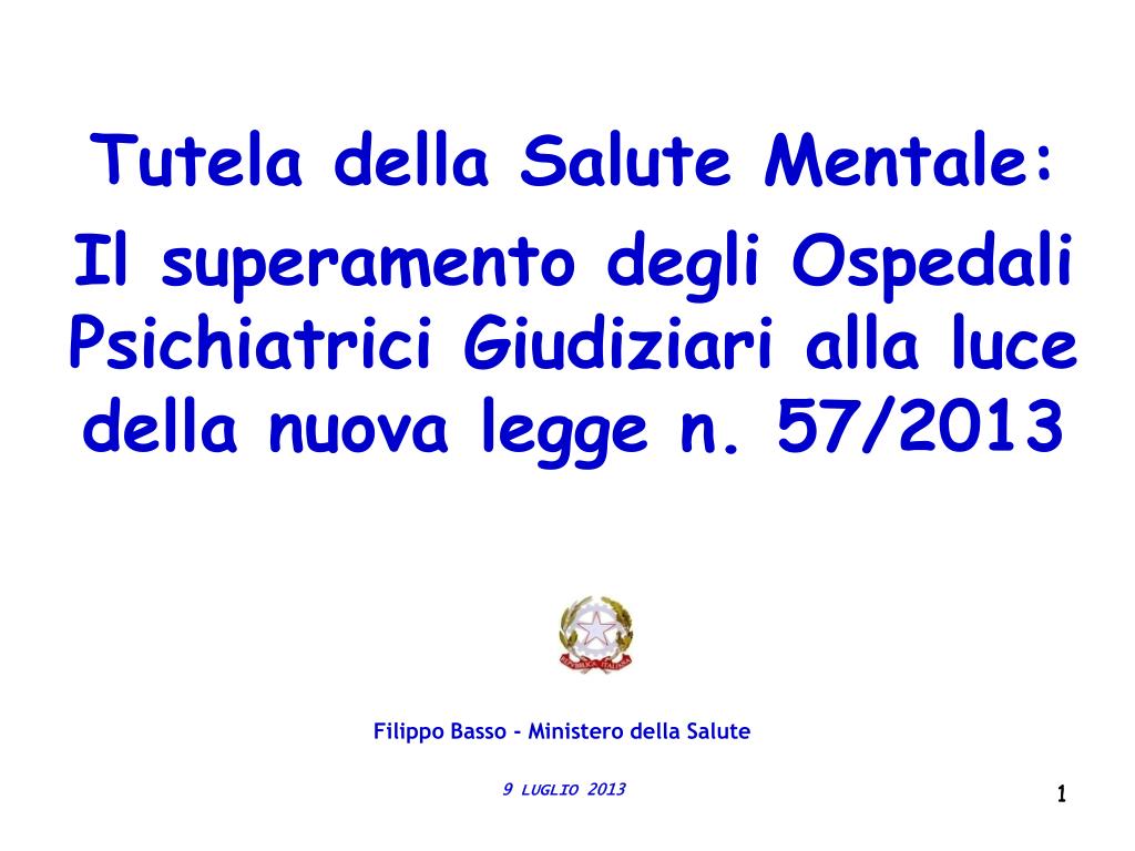 Tutela della Salute Mentale: Il superamento degli Ospedali Psichiatrici Giudiziari alla luce della nuova legge n. 57/2013 Filippo Basso - Ministero della Salute 9 LUGLIO 2013 1