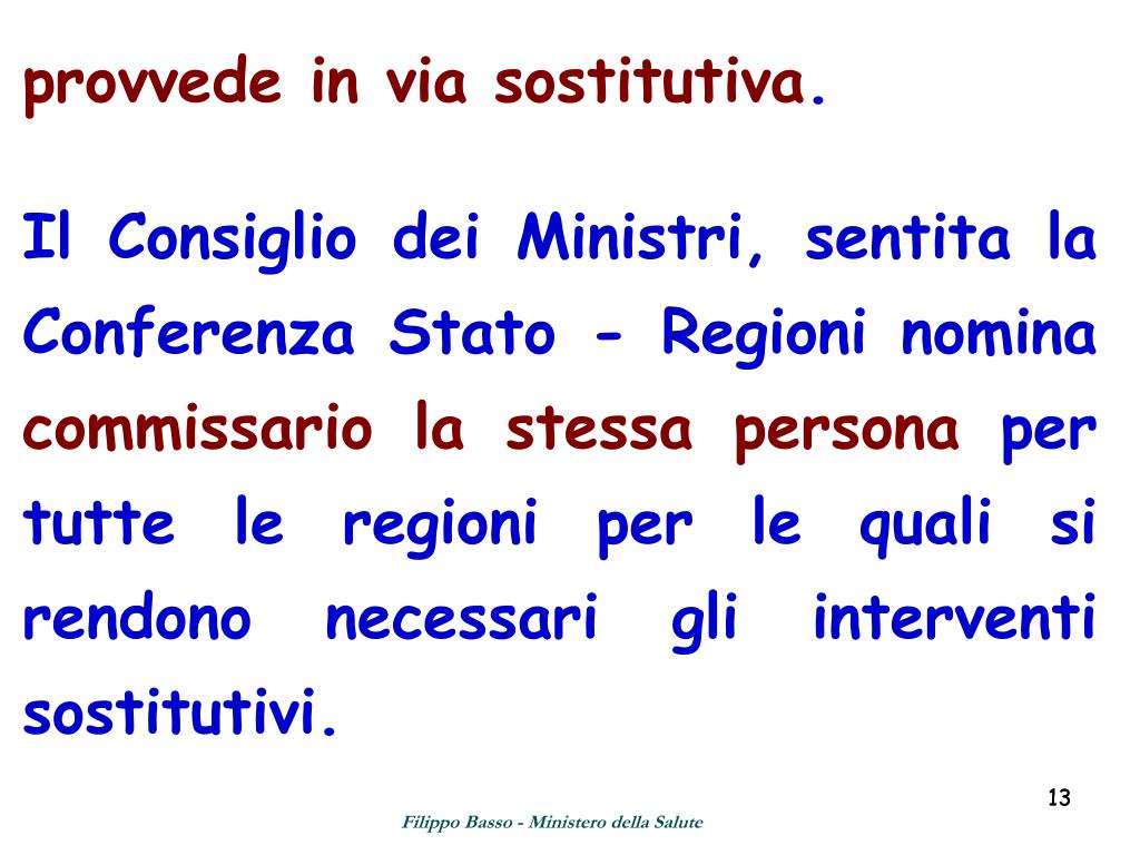 provvede in via sostitutiva. Il Consiglio dei Ministri, sentita la Conferenza Stato - Regioni nomina commissario la stessa persona per tutte le regioni per le quali si rendono necessari gli interventi sostitutivi. 13 Filippo Basso - Ministero della Salute