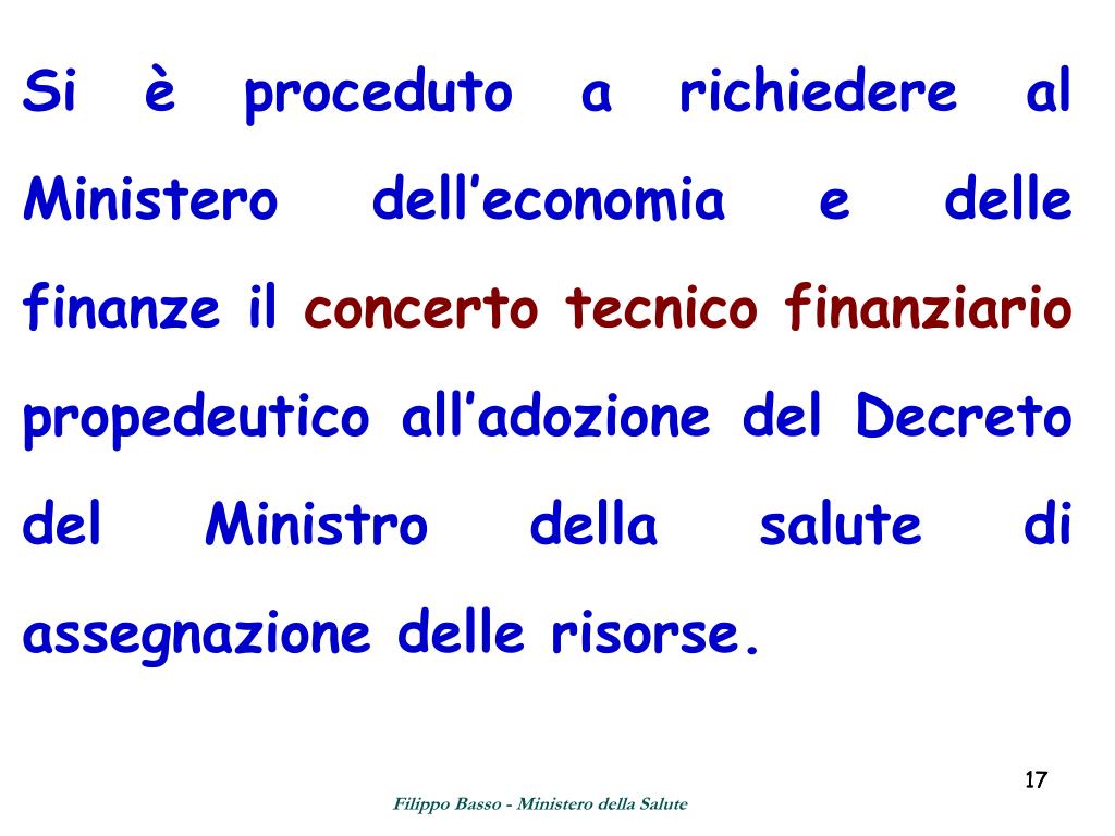 Si è proceduto a richiedere al Ministero dell’economia e delle finanze il concerto tecnico finanziario propedeutico all’adozione del Decreto del Ministro della salute di assegnazione delle risorse. 17 Filippo Basso - Ministero della Salute
